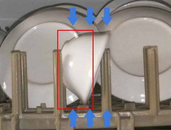 上圖所示我們可以看出:涂黑的部分是高壓噴淋沖不到的地方,還有A和B處也是無法沖洗到的,最多是其它地方的水淋上去的,“淋”與“噴”存在著根本的不同,噴是有壓力的,而淋是沒有壓力的,也就是此時(shí)沖刷餐具沒有壓力是無法確保完成噴淋沖刷動(dòng)作的。因此是沒有壓力的,清洗出來的餐具最多只有85%的干凈。如果要想餐具清潔,他們?cè)谄鸪豕ぷ麟A段給洗碗工一定的好處,在上洗碗機(jī)之前來點(diǎn)小動(dòng)作,先粗洗一下餐具,但在實(shí)際操作時(shí)根本不可能做到,所以餐具的干凈程度和人的工作質(zhì)量有關(guān),而不是靠洗碗機(jī)來保證了,因此高檔場(chǎng)所及要求較高的食堂、餐廳就要采用平放式洗碗機(jī)了。